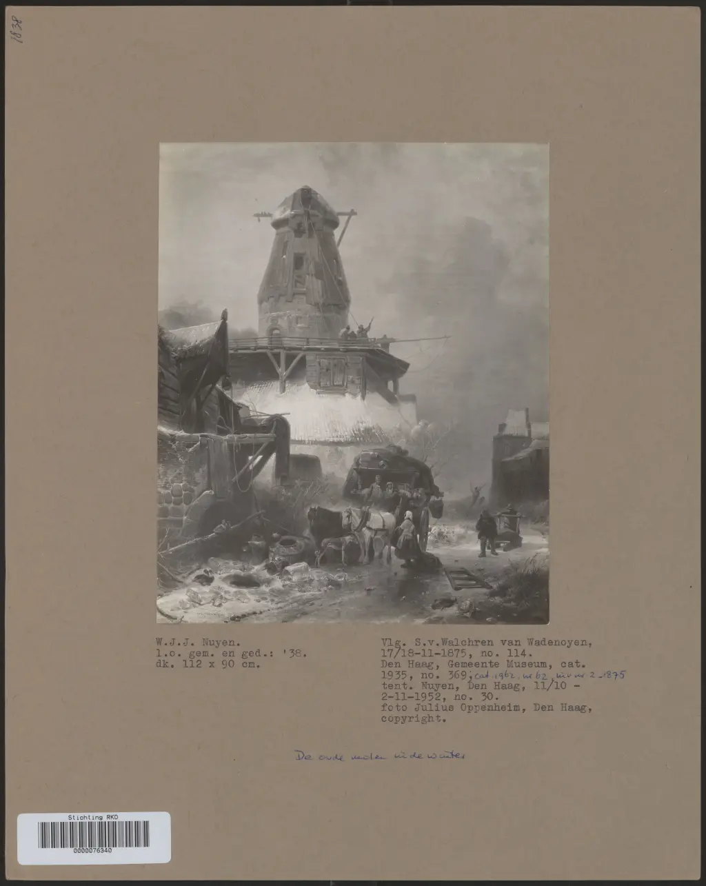 Nuyen schuwde ook in dit schilderij de tegenstelling tussen lichte en donkere partijen niet. De contouren van het gebouw links op de voorgrond tekenen zich donker af tegen het fel belichte dak van de molen, dat wit glanst van bevroren sneeuw. Het dampende witte paard steekt af tegen de twee bruine paarden, die niet meer door de zon worden beschenen.